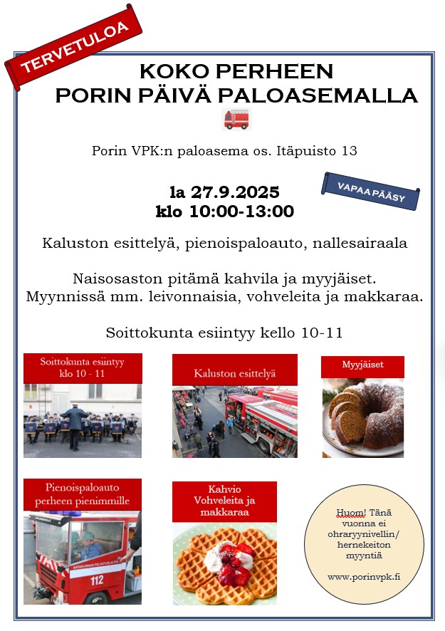 Pysäköinninvalvonta Porin VPK:n pihassa on siirretty Pysäköintiturvalle 1.11.2025 alkaen. Pysäköinti vaatii VPK:n lupalapun, kuten ennenkin. Valvontaa on kuitenkin tehostettu, joten pysäköintilapun asettamista tuulilasiin ei kannata unohtaa.